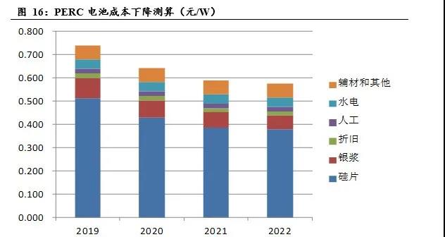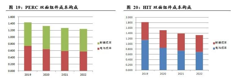 In the component link, because the heterojunction conversion efficiency is higher, it has a dilutive effect on the component packaging cost. Heterojunction conversion efficiency improves faster than PERC, so the effect of thinning on the package will continue to improve. From our measured cost downward trend, the cost of HIT components is expected to gradually decrease from 1.83 yuan / W in 2019 to 1.33 yuan / W in 2022. The cost difference with PERC will decrease from 0.39 yuan / W in 2019 to 0.08 yuan in 2022 / W.