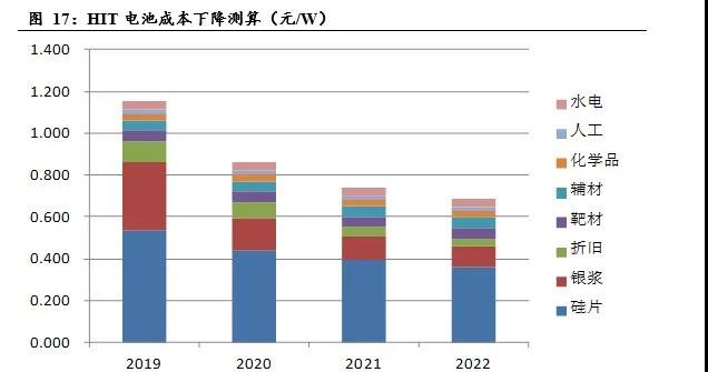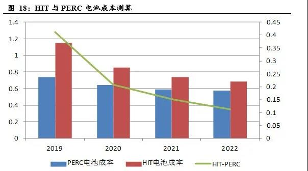 From our estimated cost decline trend, the cost of HIT batteries is expected to gradually decrease from 1.15 yuan / W in 2019 to 0.69 yuan / W in 2022, and the cost difference with PERC will decrease from 0.41 yuan / W in 2019 to 0.11 yuan in 2022. / W.
