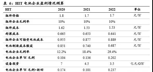 The subsequent price reduction of PERC is relatively small. We statically assume that the price of PERC components will be reduced to 1.4 yuan / W in 2021-2022, and the corresponding price of HIT components in the large-scale market is 1.7 yuan / W. According to our cost assumptions Profitability of HIT battery companies. As the heterojunction has certain compatibility in the component link, and the fixed investment cost of the component is relatively low, we assume that the pure component link can obtain 10% slightly higher than the industry's average gross profit level.